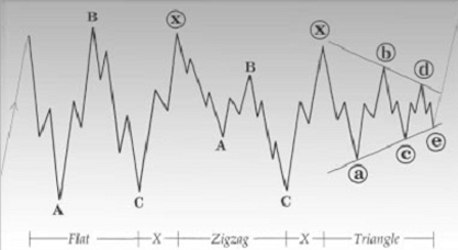 You must have already drawn attention to that the basic patterns in double and triple triplets are linked by wave X, which also turns out to be a triplet (corrective wave) and it may be a flat, zigzag and triangle.