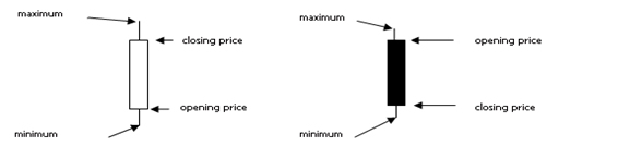 Candlesticks chart resembles sequence of candlesticks with wicks from both sides. Candlestick consists of vertical rectangle which is called candlestick body and two lines placed above and under the candlestick body. These lines are called shadows. If closing price is higher than opening one, then candlestick is white (hollow). If closing price is lower than opening one, then candlestick is black (filled). The end of the upper shadow shows the highest price of given period, and the end of the lower shadow – minimum price.
