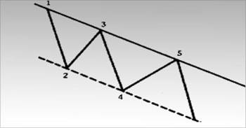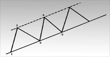 Pic.4.15 If the prices do not manage to amount to the upper channel bound and the descending trend line is traced through two sequent down-going peaks (line 3-5), then it is possible to construct a probationary channel line. It will take its rise from the fall point 4 alongside with the lines 3-5. At times, this ground channel line is employed as an initial support level for the new tendency.