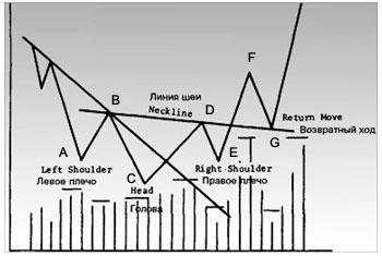 Pic. 3. Inverse head-and-shoulders pattern example. Bottom pattern is a mirror image of top pattern in this case. The neckline is formed from the B point – first peak of figure formation, through the D point. Reversal price movement to the neckline after the break is more typical for the bottom patterns.